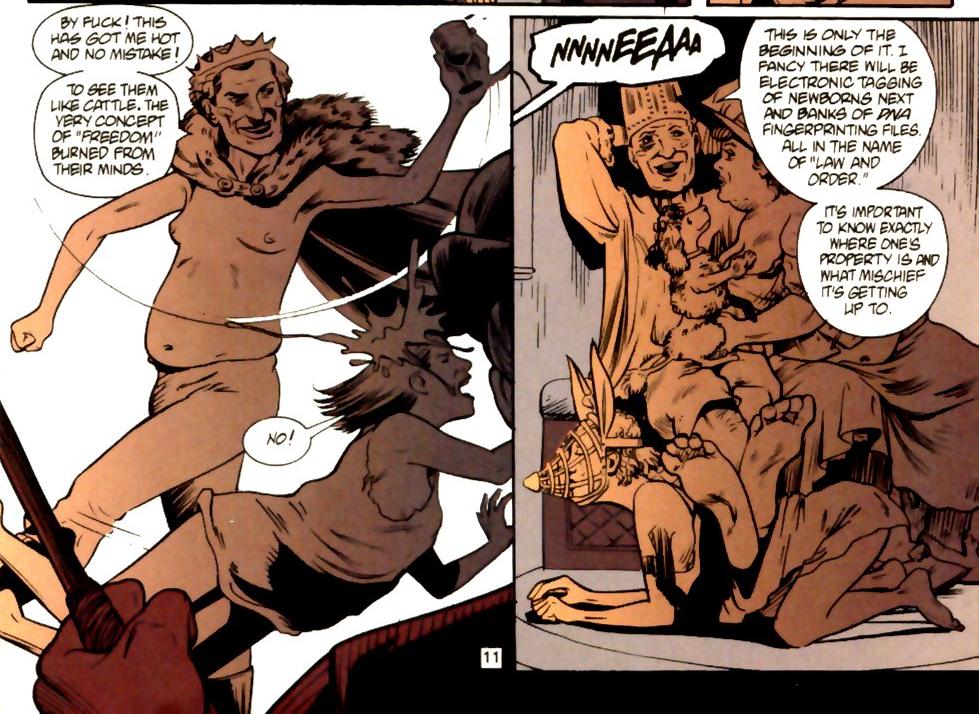 King Mob and Boy are lost on the "ontic highway" with the psychic projection of De Sade. Their surroundings quickly transition from the "Et Arcadia Ego" postcard into Castle Silling, the setting of De Sade's "120 Days of Sodom." The trio are forced to watch a slightly modified version of the events of the book (a vicious satire in which four powerful men kidnap several young people to an isolated castle and wantonly use them to fulfill their every perversion before killing them) before they are allowed to continue on their journey to De Sade's ultimate destination, San Francisco.