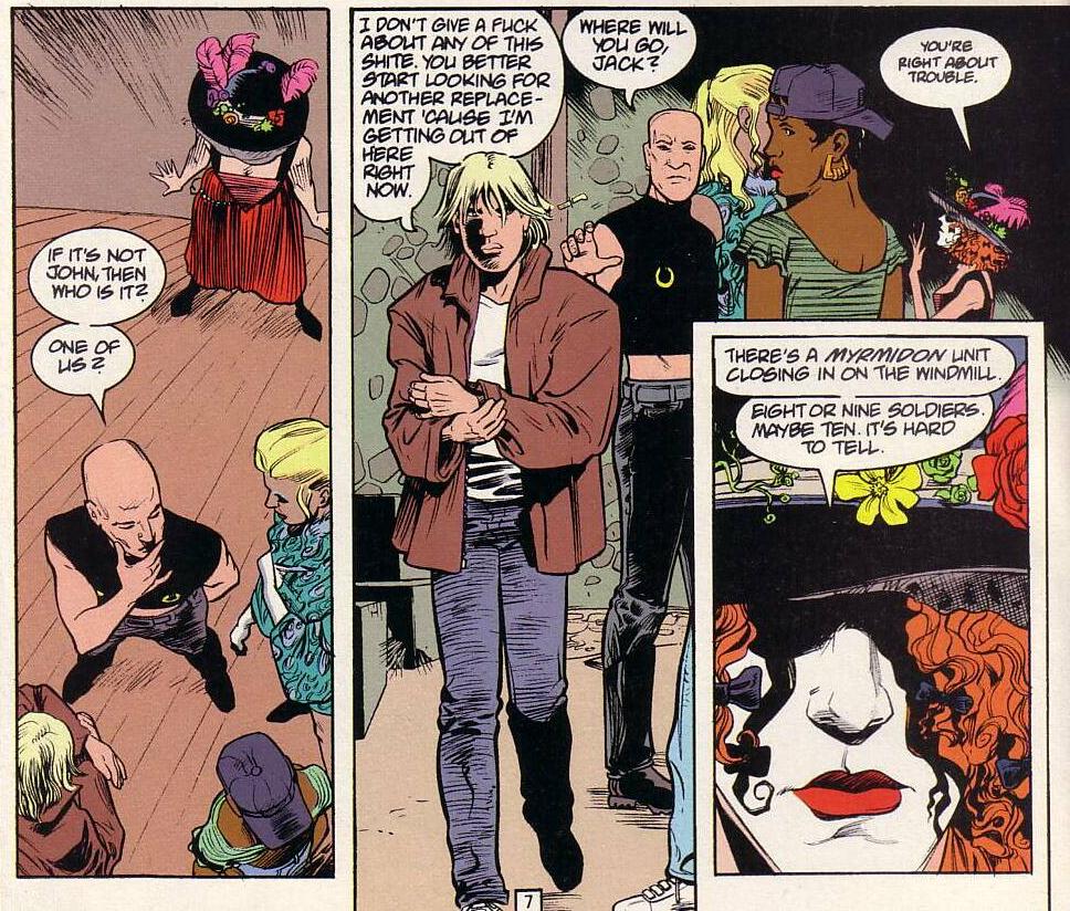 This is also the first issue where we meet Dane's predecessor, John-a-Dreams (the name is another Shakespeare reference, this time from Hamlet, for a man who gets lost in his daydreams). It's interesting to see King Mob, here, in a clearly deferential role. John's the guy who understands what's going on here - KM just wants something concrete he can shoot.
