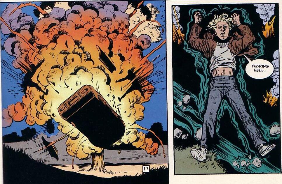 Note is made of Dane's incredible luck - the car is shot before it can explode, he's not hurt in the crash, the explosion takes out the people out to get him. King Mob, super-spy assasin, barely gets out of this situation alive, while our favorite little punk breezes through. Is he just lucky? Is he using the magic powers Tom planted in his head? Or is it just that, as a main character, he's protected by a higher power? Dane's clearly special, but he's only special because Grant Morrison decided he is. He was chosen by a normal, human man with control over this reality (and yeah, the Invisibles isn't real, but we keep getting told that "real" doesn't matter) to be the Messiah. So of course he's not going to get blown up 9 issues in.