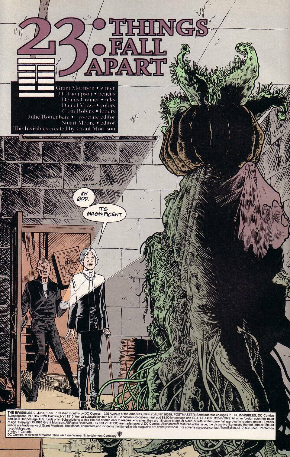 Later on, King Mob will describe the things that he and John see here (and which we won't for a long, long time) as a "prototype" community - first steps from an encroaching universe into our (or at least the Invisibles') own. So the question is... are we at war? Is it us vs. them? Does John-a-Dreams's description of the dead plant monster as "magnificent," show him as a traitor in the making? Or is it just that he's more tapped into the truth: There is no war. (Follow-up question: If you refuse to see sides in a conflict, can you be a traitor?)