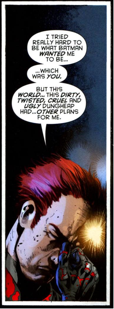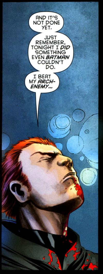 And Jason Todd, killed by readers and resurrected by shifts in continuity (he was, really, brought back to life by an evil Superboy punching the walls of the universe) is trying to impose his story onto the Batman narrative. In Jason's story, he's the charismatic dark hero, using intense violence to put criminals down forever. "Heroes" like Batman are ineffectual jokes that exist to make him look stronger. In Jason's story, Jason wins.