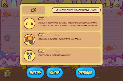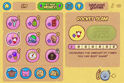 In contrast, let's look at a game I've talked about on here before, Burrito Bison Revenge. BBR (produced by Juicy Beast) shares many design elements with NNC!!, - timing based launching, special units that boost or reduce speed, a limited control scheme prioritizing carefully timed interventions), but adds a few things that really let the game put its hooks in. (An easy way to know when a game 'has' you, and one I'll refer to repeatedly here, is when you have the thought "I'll just play until _____," where _____ is some measure of in-game progression. Once you've started bargaining with yourself for more playtime, you know you're in trouble). The first is an upgrade system, where in-game currency can be spent to enhance various features of your flight (stronger launches, less speed lost from mistakes, more control interventions, and several others). This does two important things: One, it gives the player a small-scale goal to play toward - "I'll stop once I've got enough money for that top speed upgrade" (but of course, you're going to want to TRY OUT the new upgrade, aren't you? And now you're so close to that bounciness upgrade...)- and two, it ensures that the player, regardless of skill level, will do better and better as play continues. Even if the player never gets better at using the rocket slams (the game's limited control scheme), by nature of upgrading their character, they'll go, generally, further and further with every launch. Thus, you avoid the discouraging scenario often found in NANACA, where a great launch can be followed by an abysmally cut-short one; instead, you have a constant, pleasing feeling of (fake) improvement.